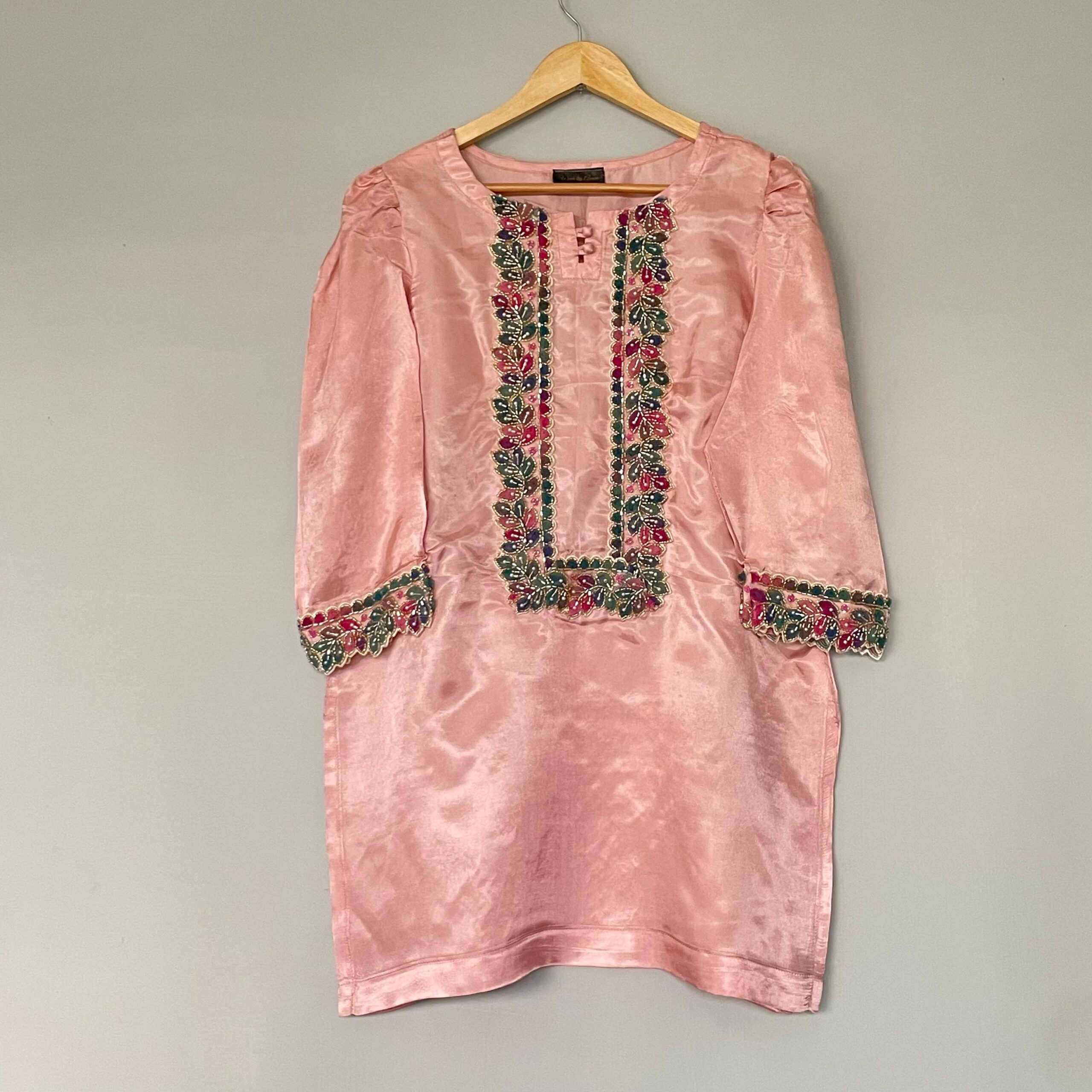 Features: 3 quarter puffy sleeves & lace work on shirt neckline along with 2 cloth buttons